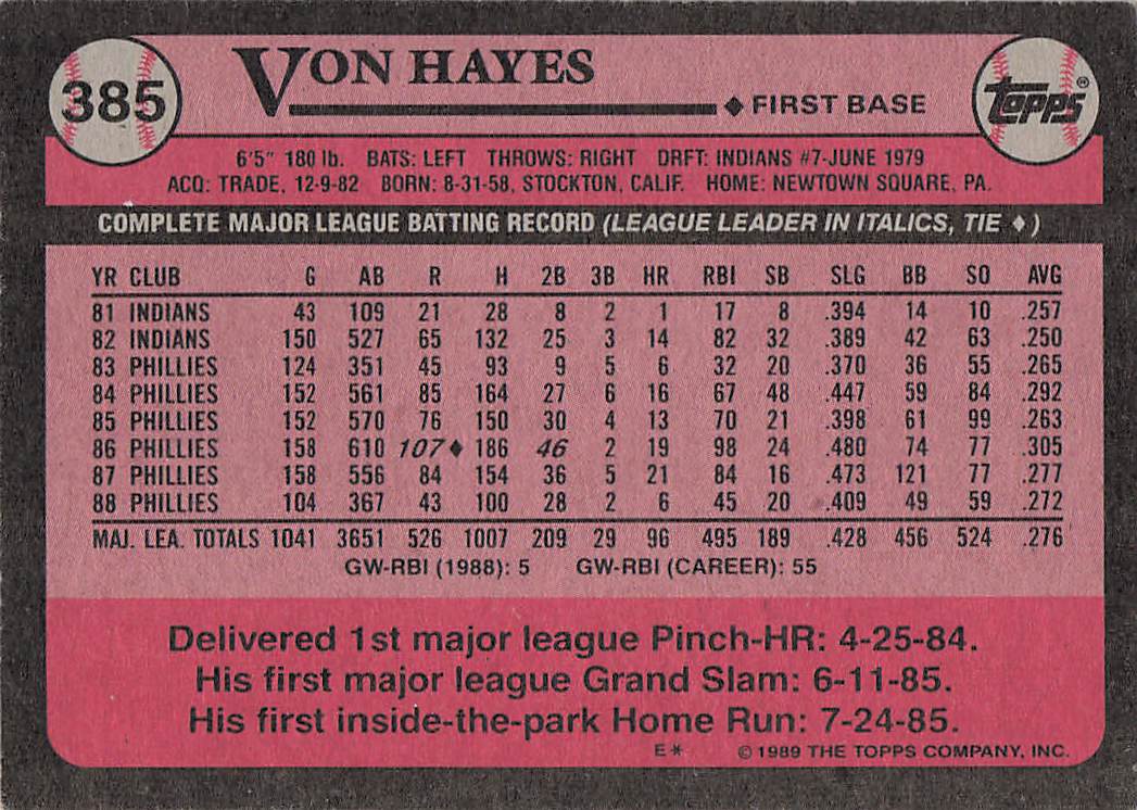 1990 Donruss Baseball Bonus MVP's Von Hayes #BC-25