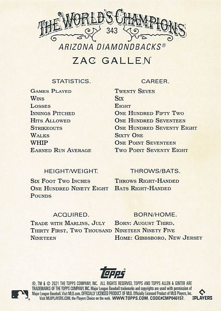 2021 Topps Allen & Ginter Silver Portrait Zac Gallen #343 SP