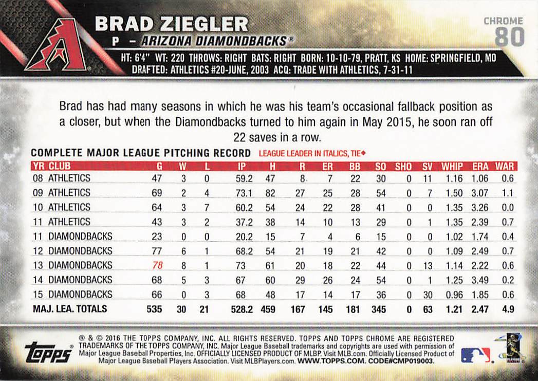 2016 Topps Chrome Brad Ziegler #80