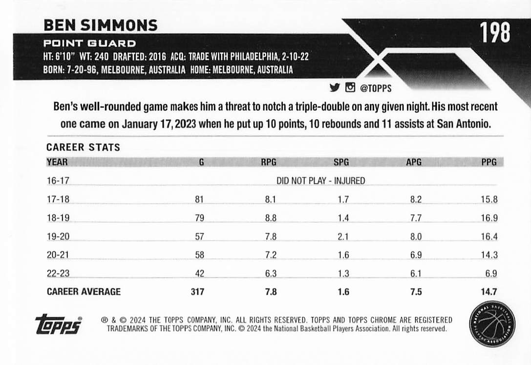 2023-24 Topps Chrome Basketball Ben Simmons #198