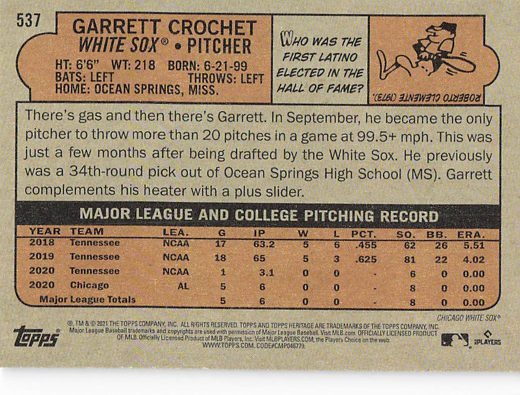 2021 Topps Heritage Baseball Garrett Crochet #537 RC