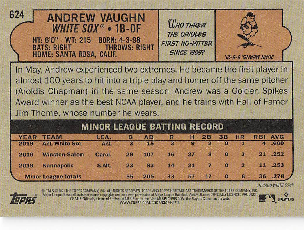 2021 Topps Heritage Baseball Andrew Vaughn #624 RC