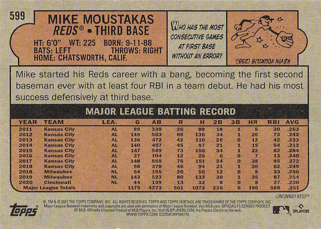 2021 Topps Heritage Baseball Mike Moustakas #599