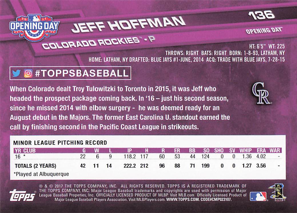 2017 Topps Opening Day Jeff Hoffman #136 RC