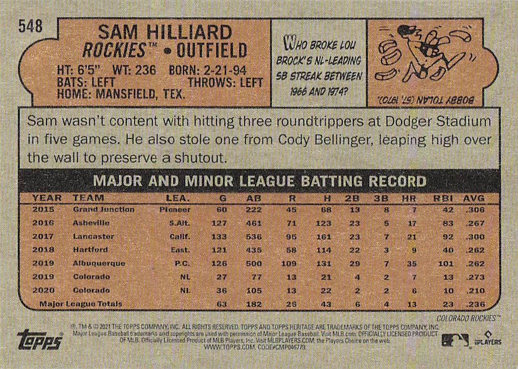 2021 Topps Heritage Baseball Sam Hilliard #548