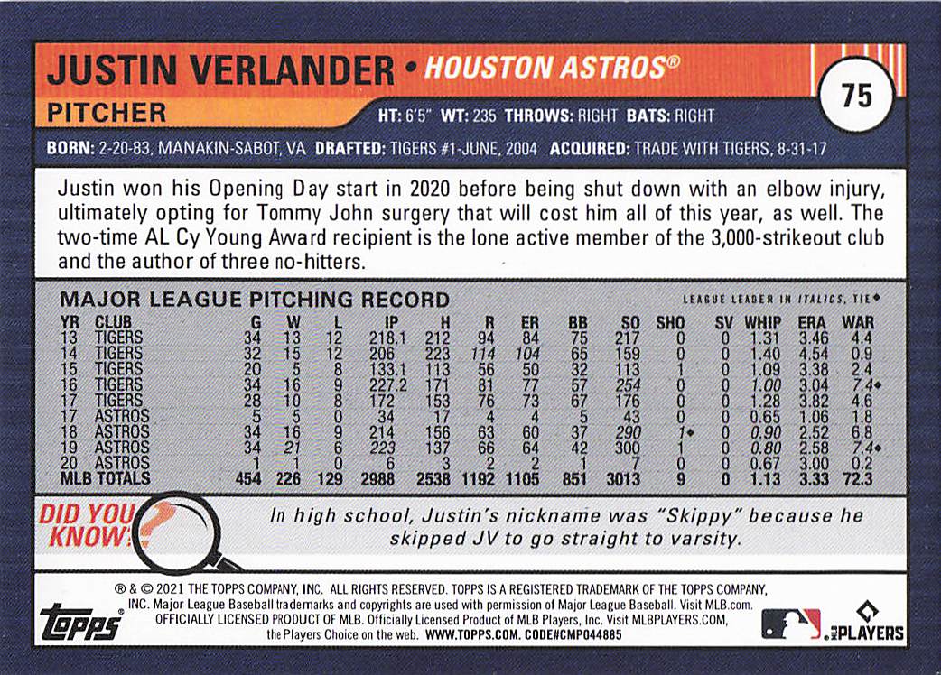 2021 Topps Big League Orange Justin Verlander #75