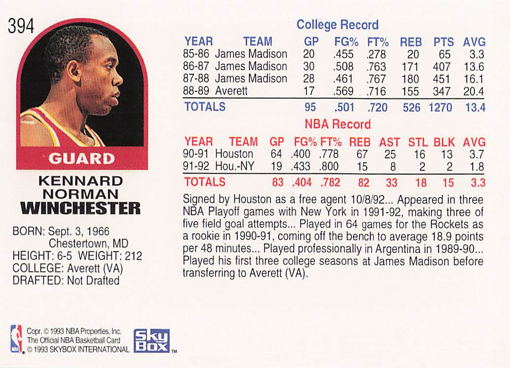 1992-93 NBA Hoops Kennard Winchester #394