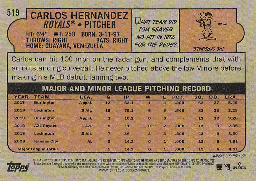 2021 Topps Heritage Baseball Carlos Hernandez #519 RC