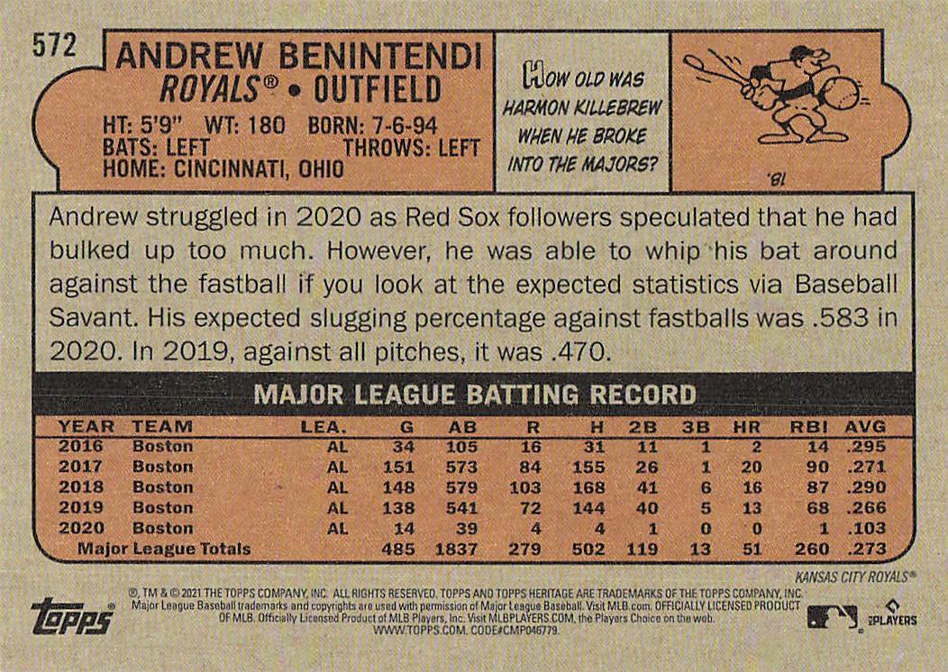 2021 Topps Heritage Baseball Andrew Benintendi #572