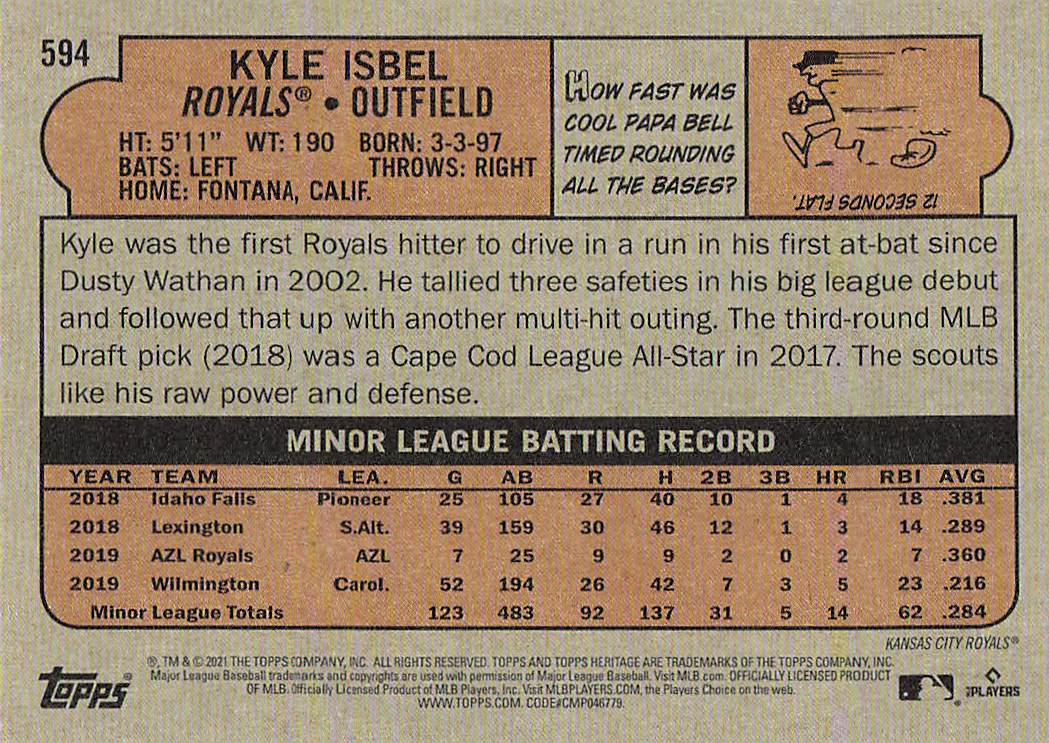 2021 Topps Heritage Baseball Kyle Isbel #594 RC