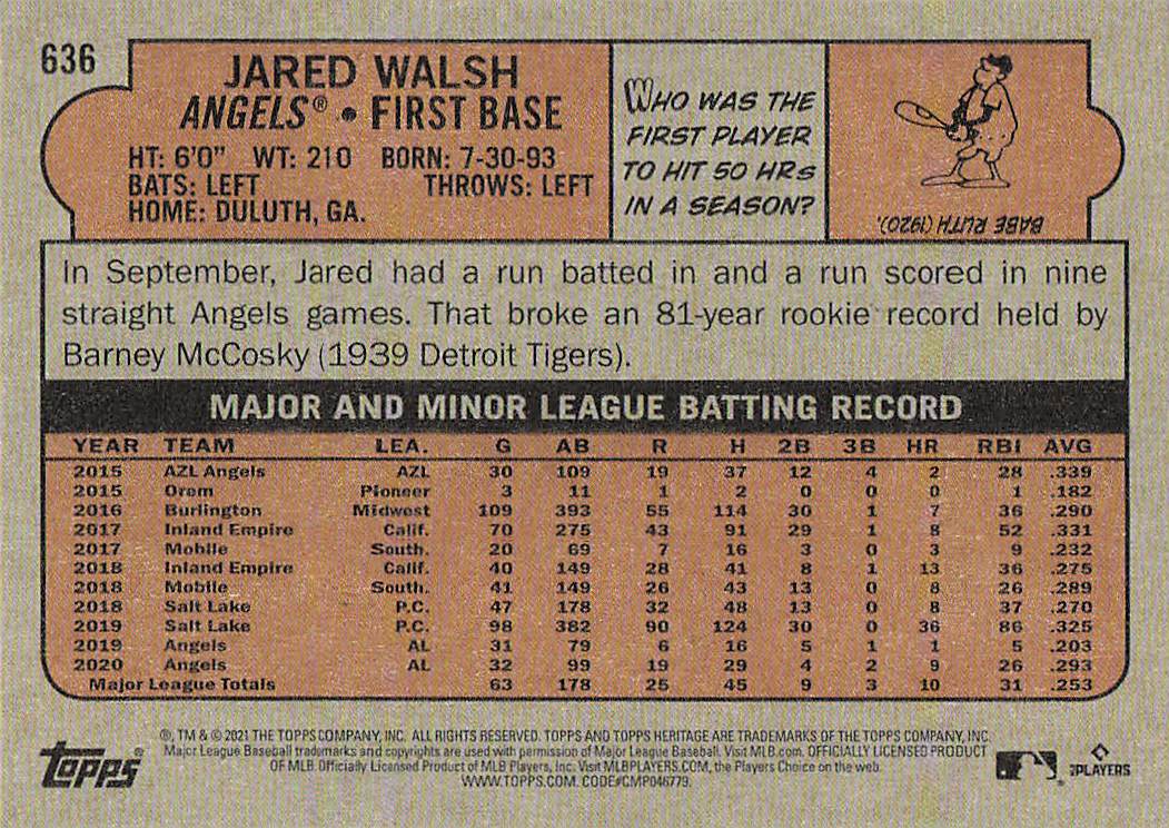 2021 Topps Heritage Baseball Jared Walsh #636 RC