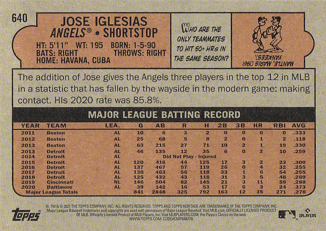 2021 Topps Heritage Baseball Jose Iglesias #640