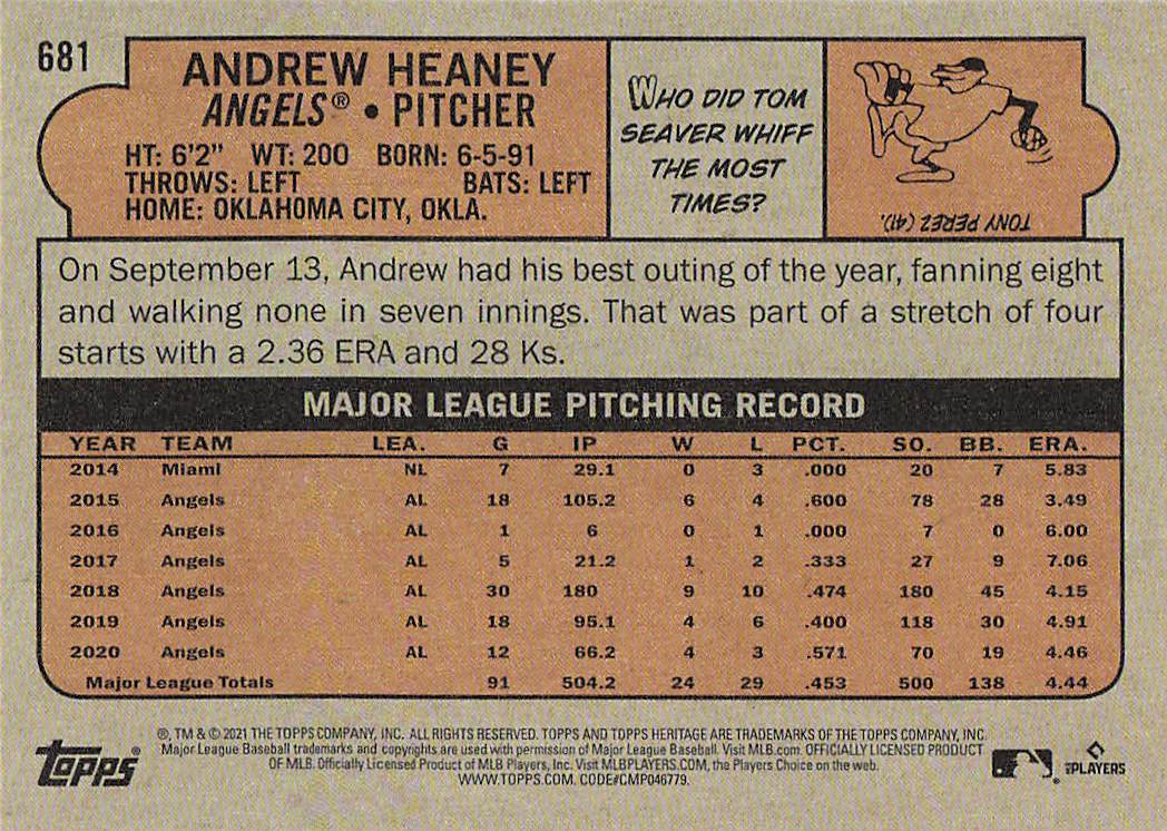 2021 Topps Heritage Baseball Andrew Heaney #681
