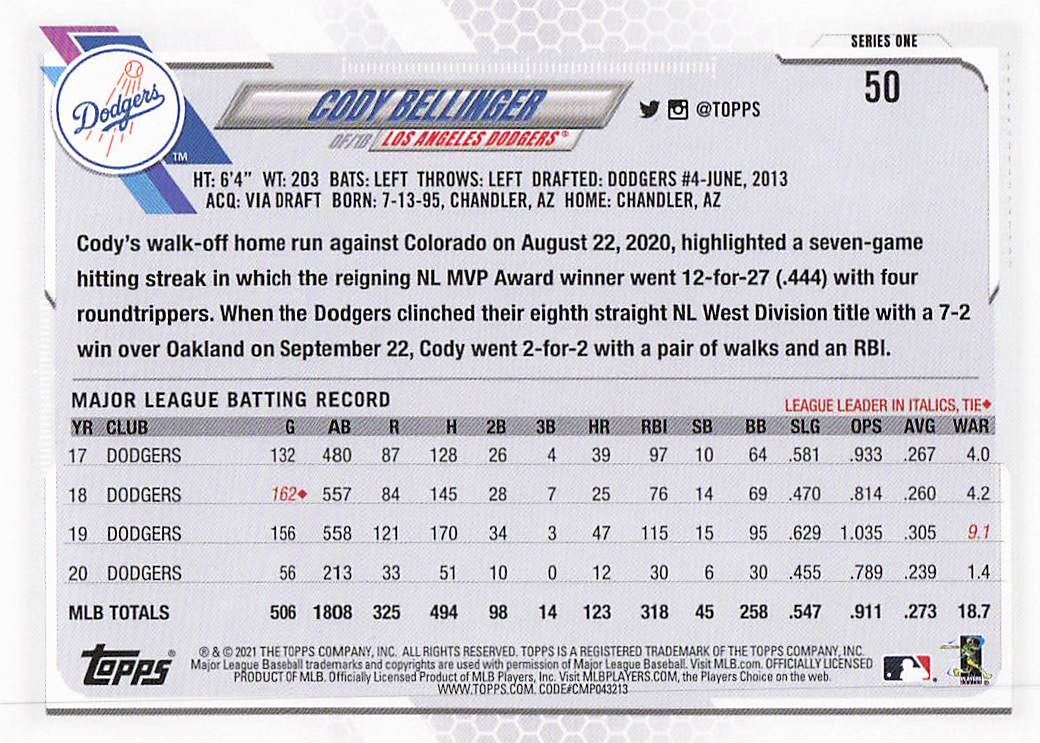 2021 Topps Series 1 Cody Bellinger #50