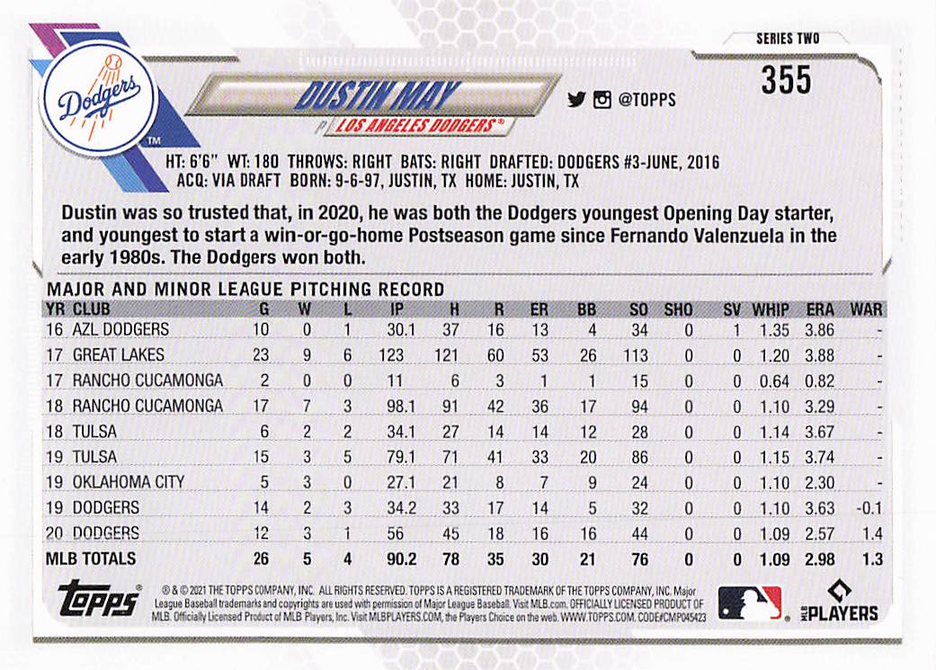 2021 Topps Series 2 Dustin May #355