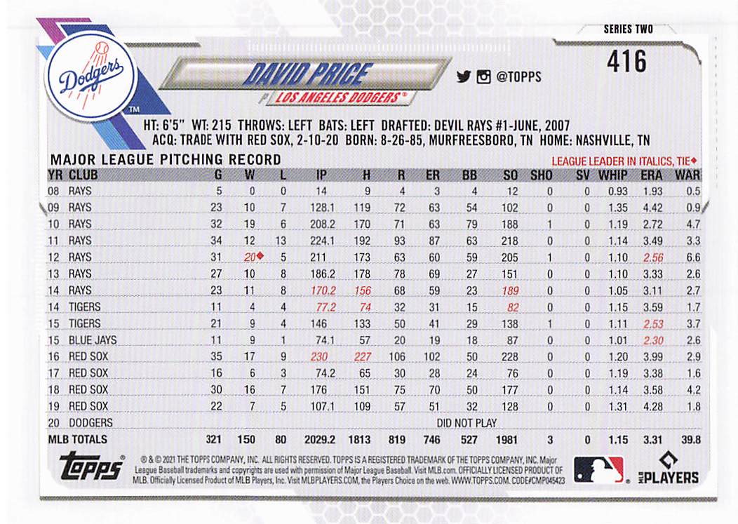 2021 Topps Series 2 David Price #416