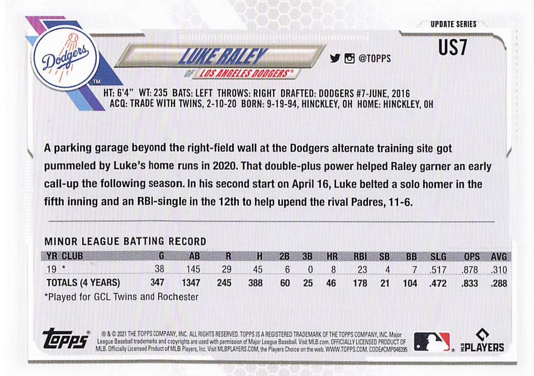 2021 Topps Update Luke Raley #US7 RC