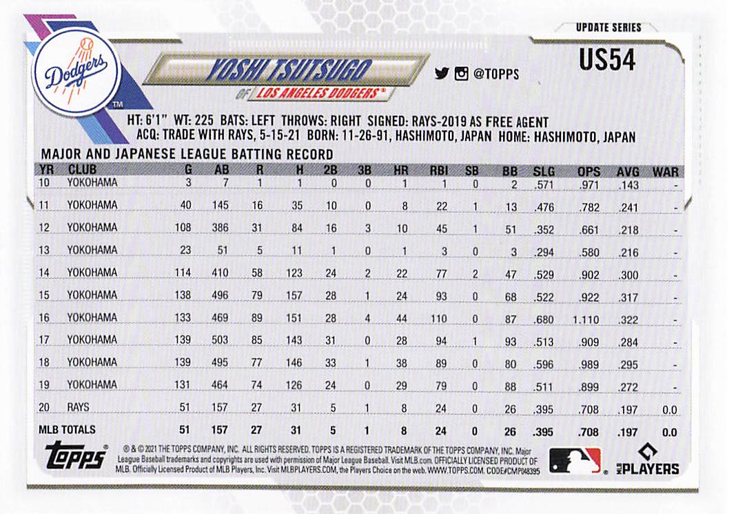 2021 Topps Update Yoshi Tsutsugo #US54