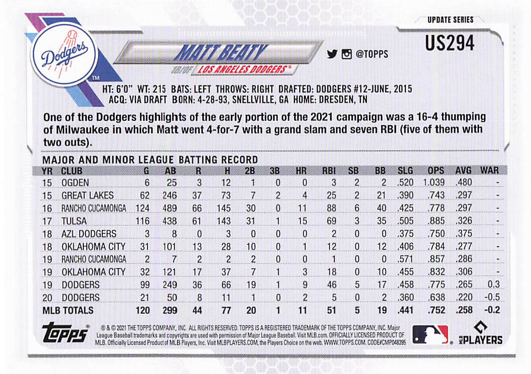 2021 Topps Update Matt Beaty #US294