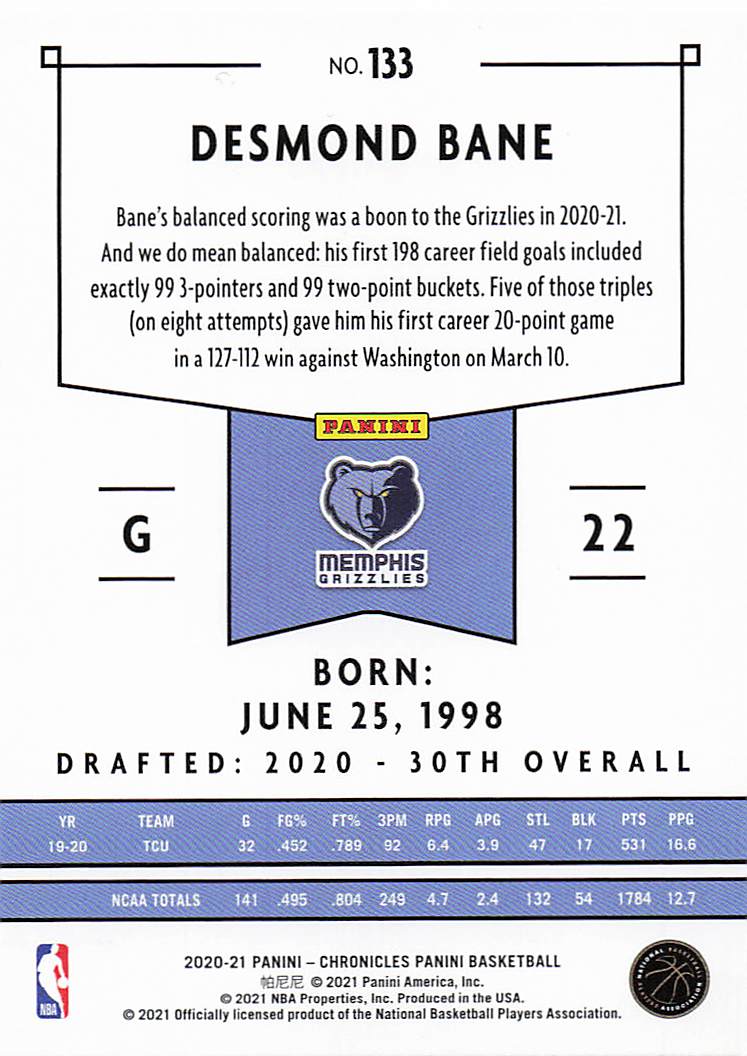 2020-21 Panini Chronicles Panini Desmond Bane #133 RC