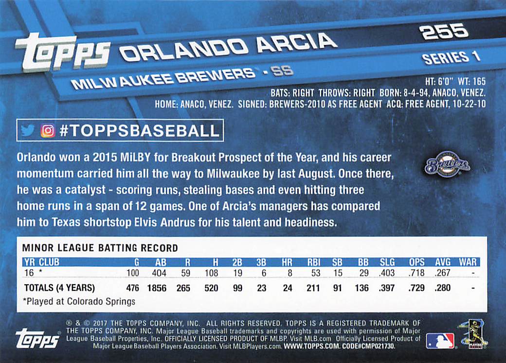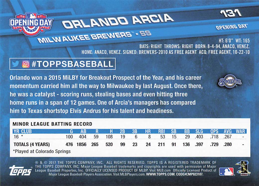 2017 Topps Opening Day Orlando Arcia #131 RC