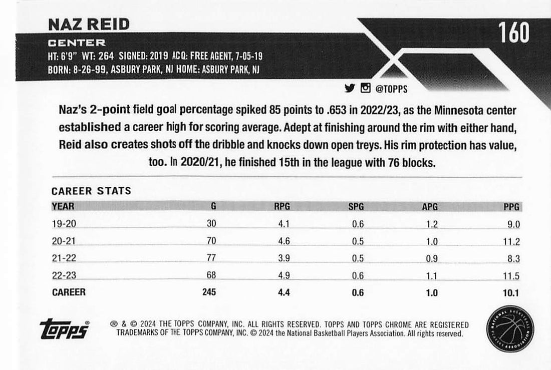 2023-24 Topps Chrome Basketball Naz Reid #160