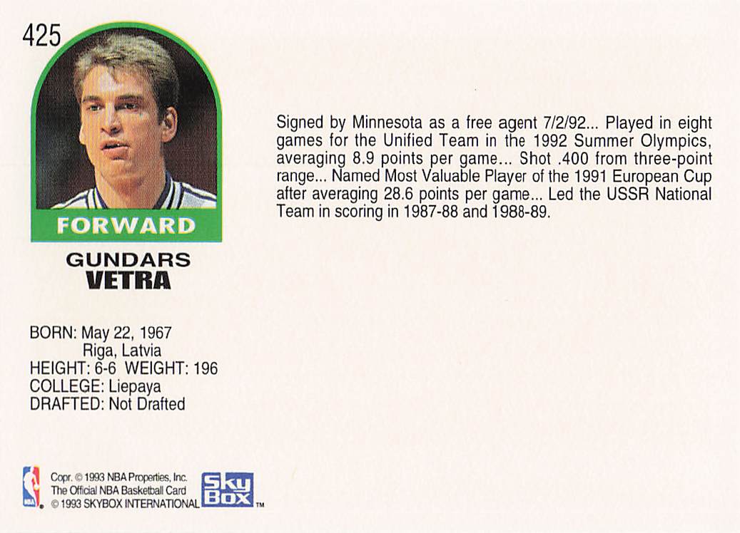 1992-93 NBA Hoops Gundars Vetra #425 RC