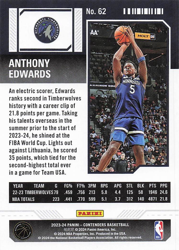 2023-24 Panini Contenders Basketball Anthony Edwards #62