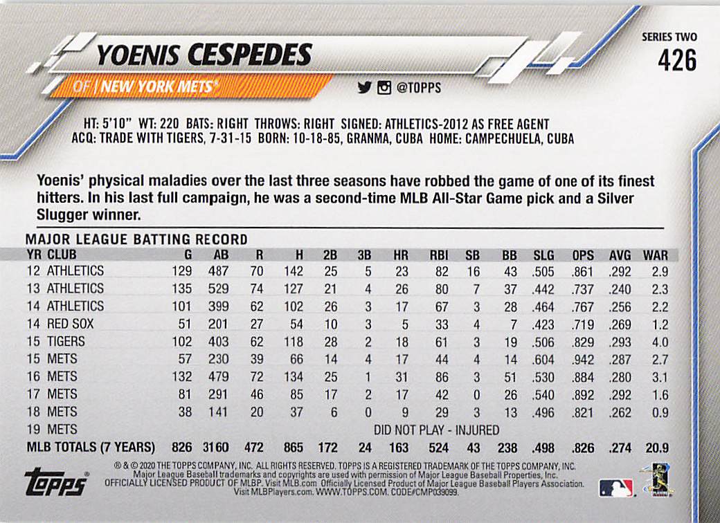 2020 Topps Series 2 Yoenis Cespedes #426