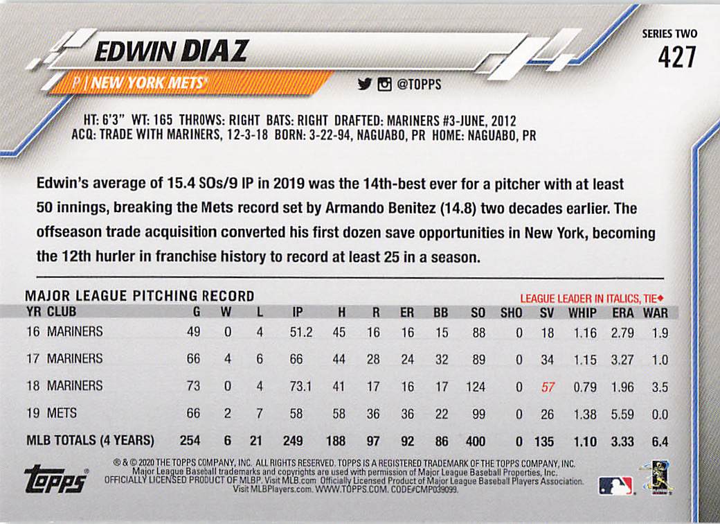 2020 Topps Series 2 Edwin Diaz #427