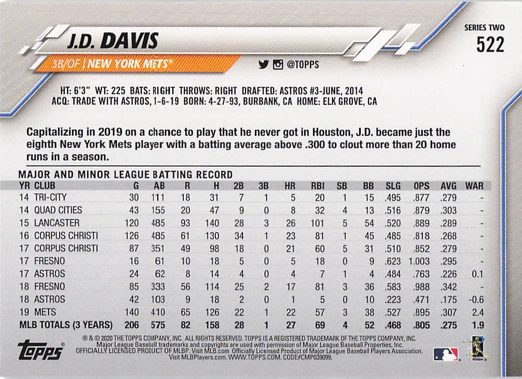 2020 Topps Series 2 J.D. Davis #522