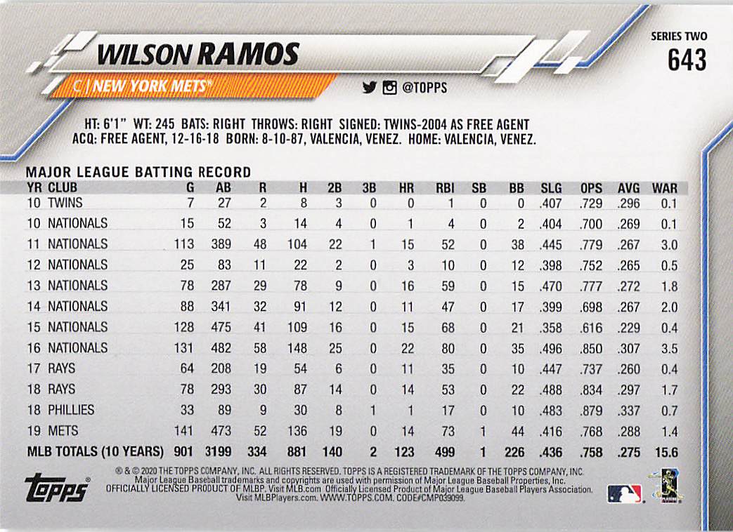 2020 Topps Series 2 Wilson Ramos #643
