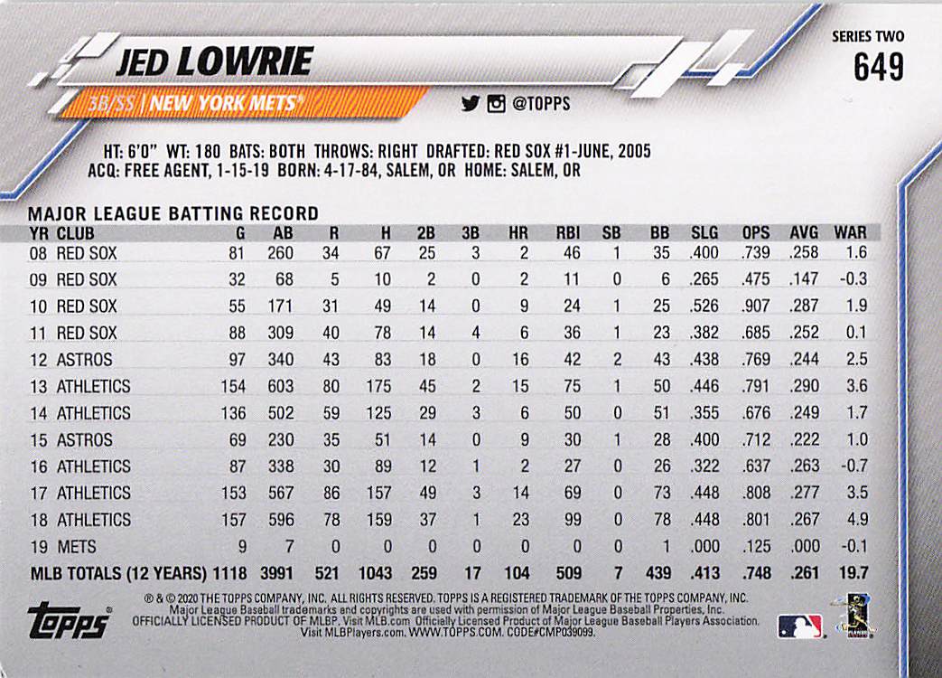 2020 Topps Series 2 Jed Lowrie #649
