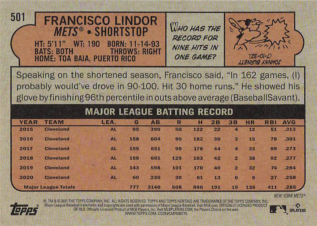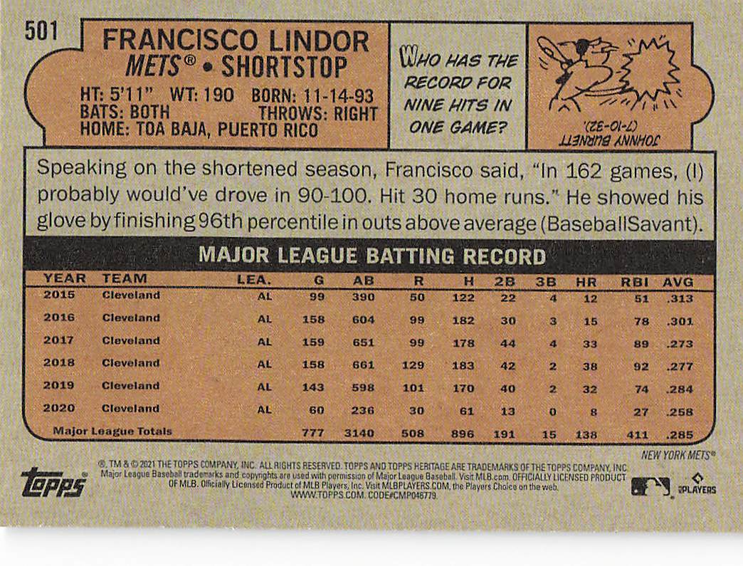 2021 Topps Heritage Baseball Francisco Lindor #501