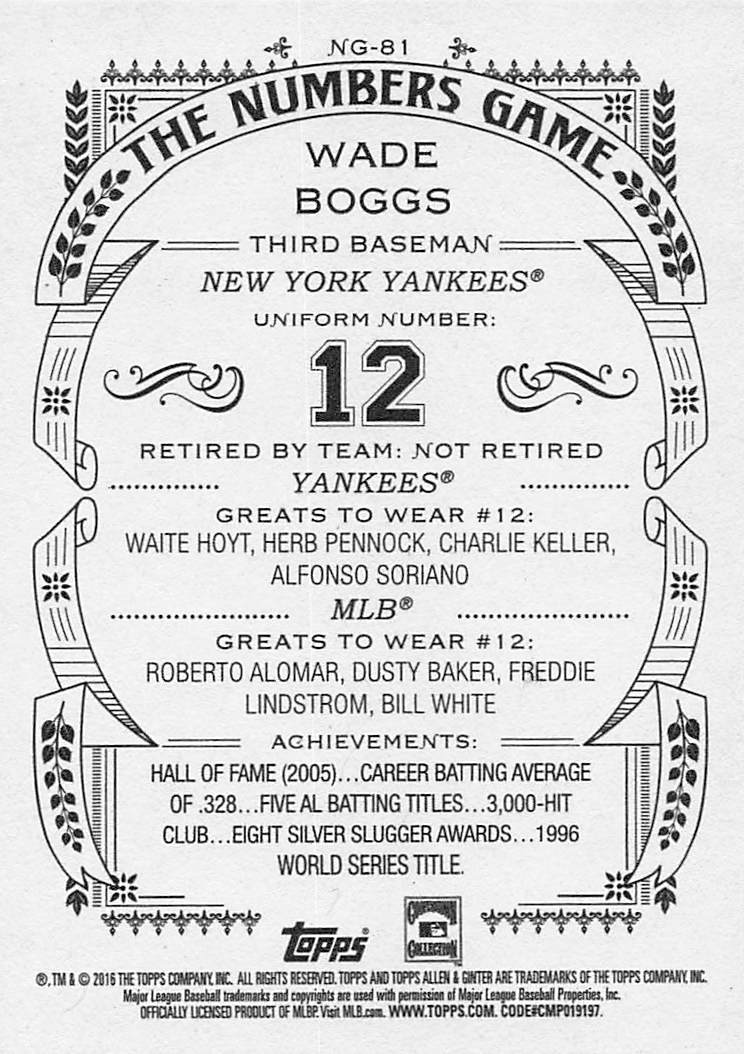 2016 Topps Allen & Ginter Numbers Game Wade Boggs #NG-81