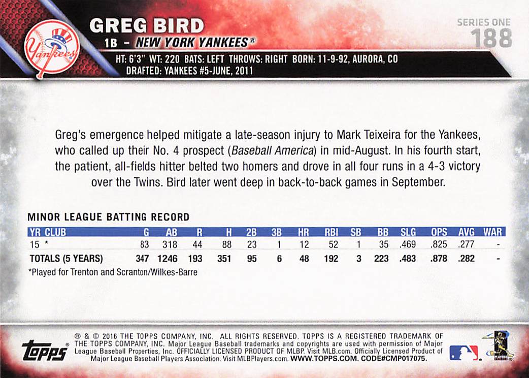 2016 Topps Greg Bird #188 RC