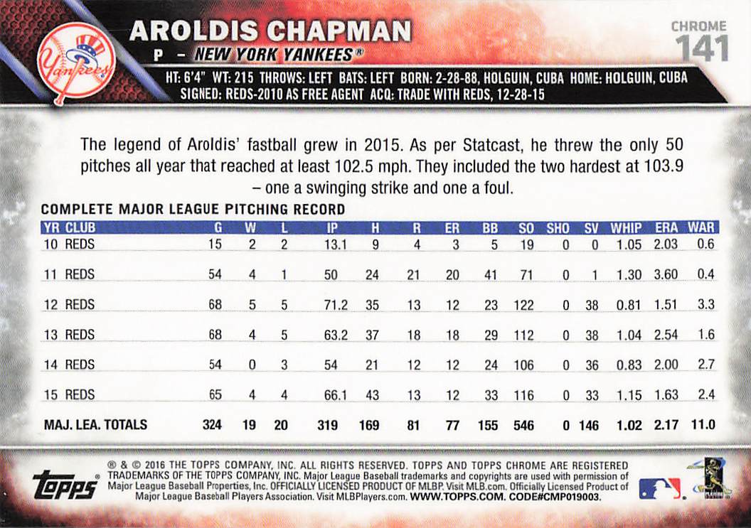 2016 Topps Chrome Aroldis Chapman #141