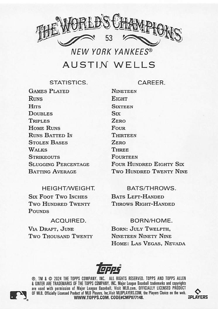 2024 Topps Allen & Ginter Silver Portrait Austin Wells #53 RC