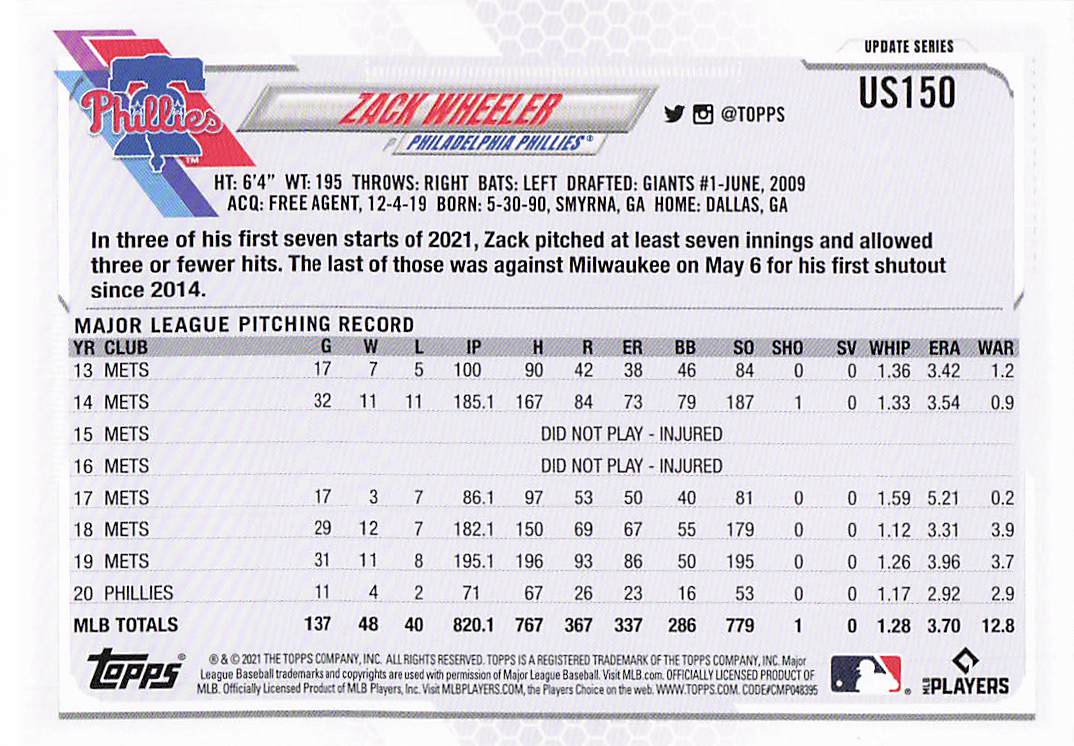 2021 Topps Update Zack Wheeler #US150