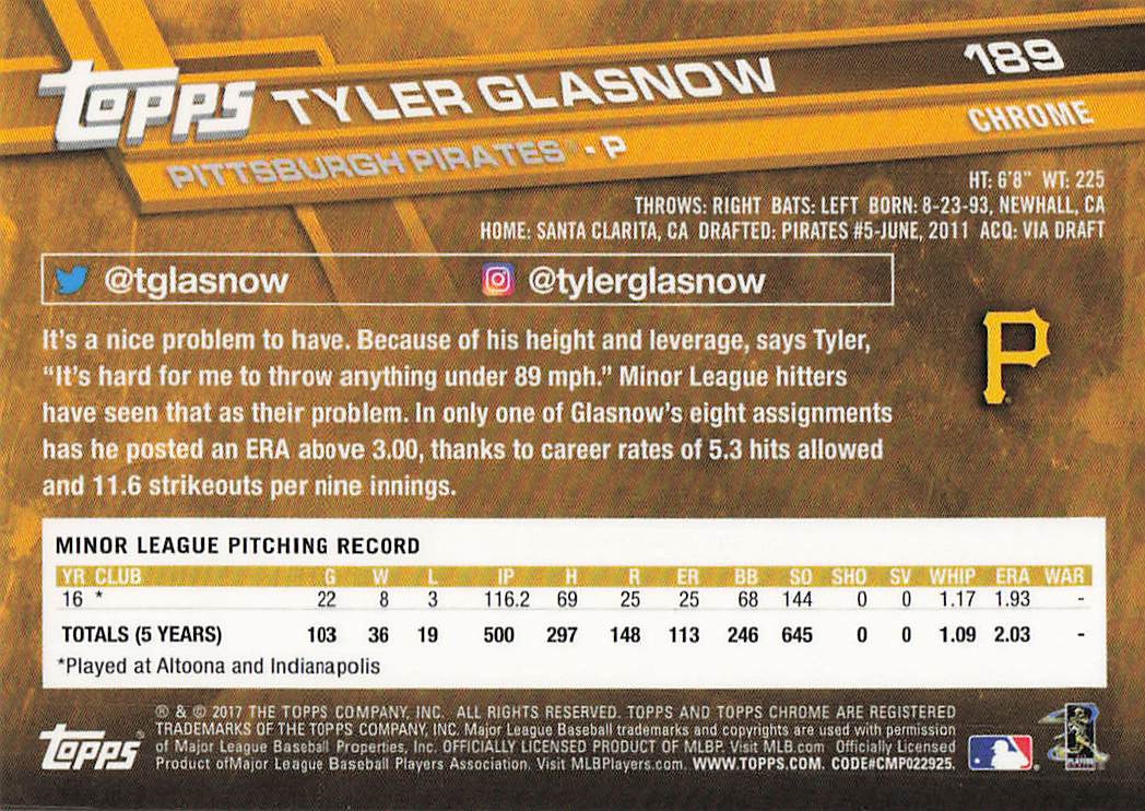 2017 Topps Chrome Tyler Glasnow #189 RC
