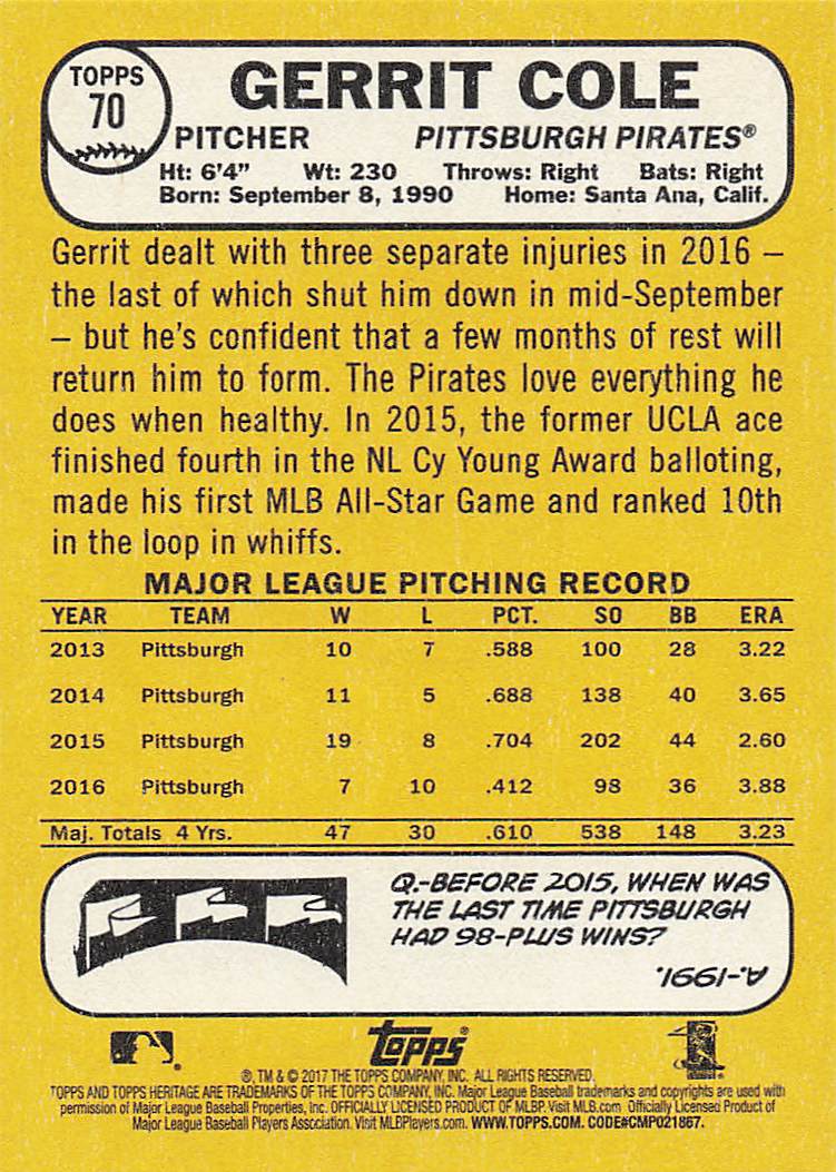 2017 Topps Heritage Gerrit Cole #70