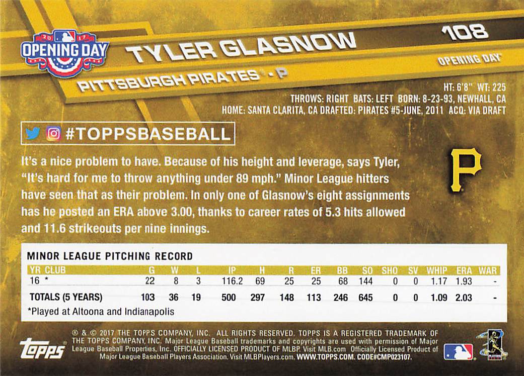 2017 Topps Opening Day Tyler Glasnow #108 RC