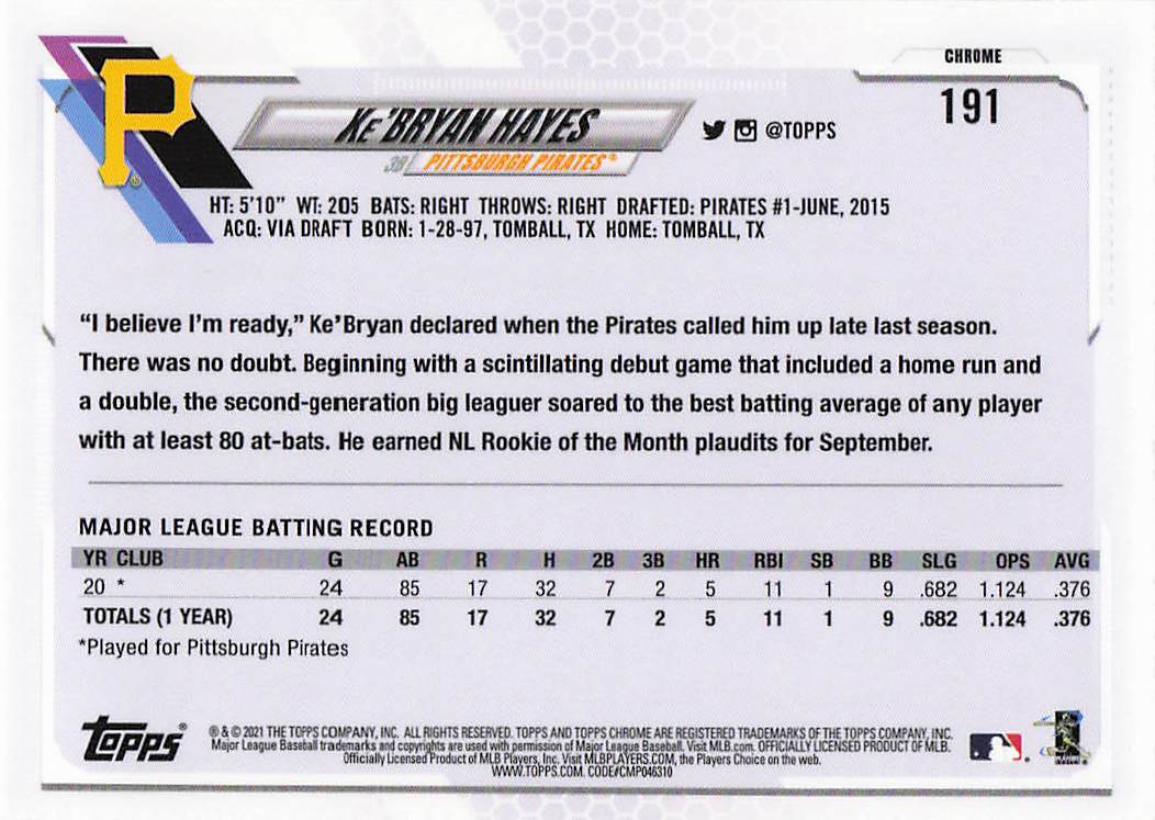 2021 Topps Chrome Ke'Bryan Hayes #191 RC