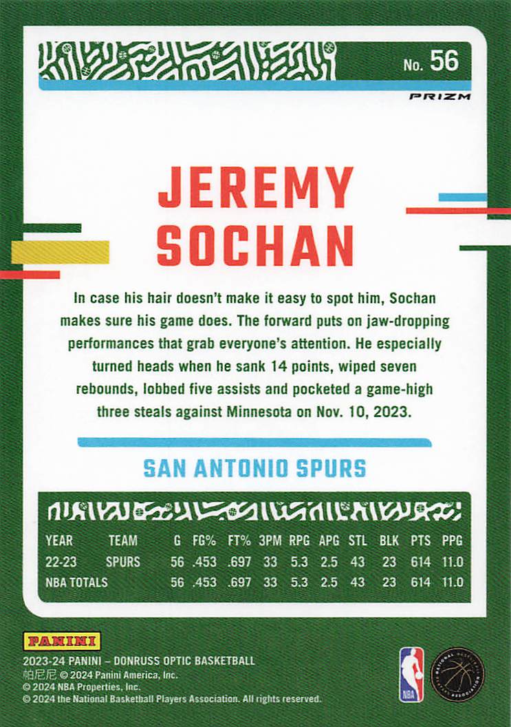 2023-24 Donruss Optic Basketball Holo Prizm Jeremy Sochan #56
