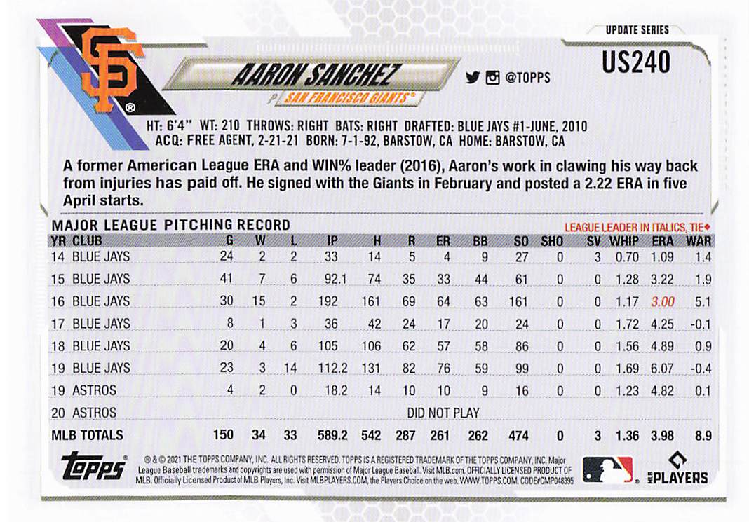 2021 Topps Update Aaron Sanchez #US240