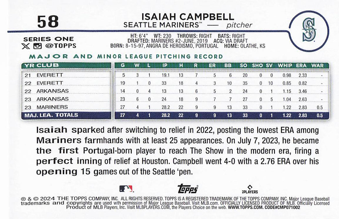 2024 Topps Series 1 Isaiah Campbell #58 RC