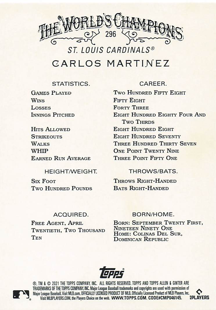 2021 Topps Allen & Ginter Silver Portrait Carlos Martinez #296