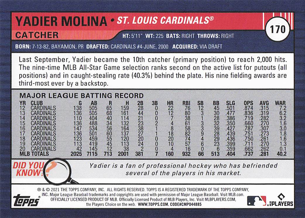 2021 Topps Big League Defensive Wizards Yadier Molina #DW-7