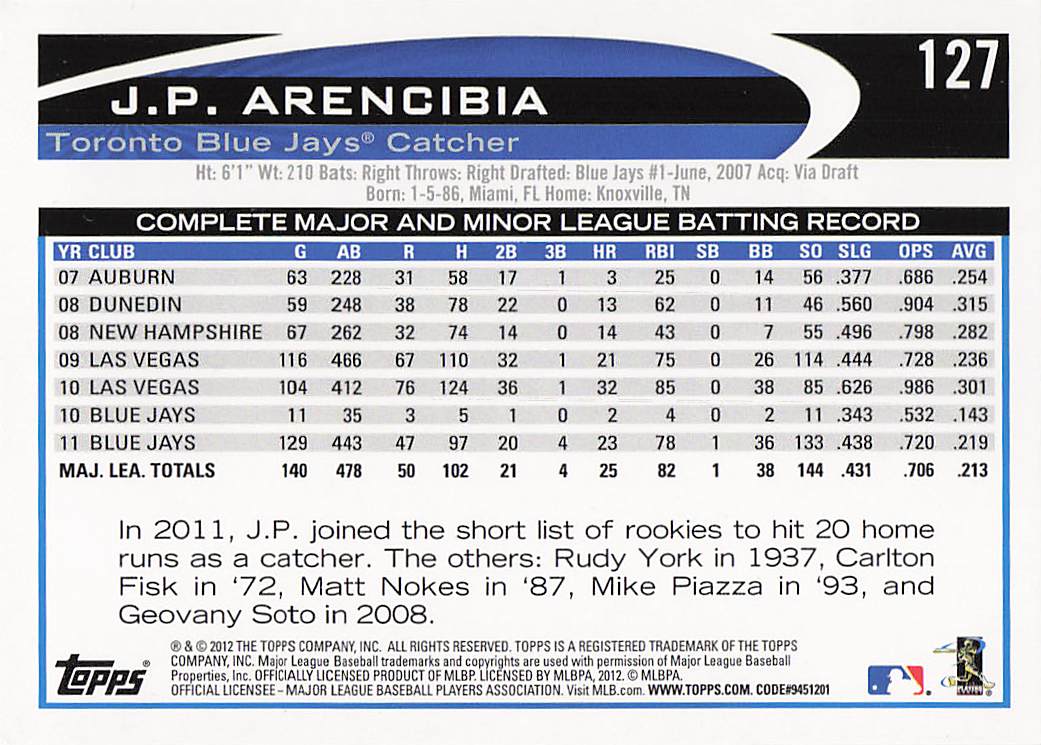 2012 Topps Opening Day Baseball J.P. Arencibia #127