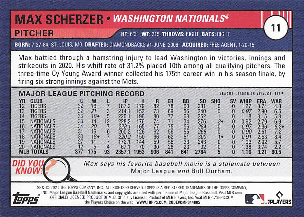 2021 Topps Allen & Ginter's Mini A&G Back Max Scherzer #52